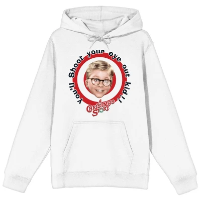 - GRAPHIC DESIGN: Ralphie appears in a red bull’s eye on this hoodie as black text around the character reads, “You’ll shoot your eye out, kid.” Fans of the movie will recognize the quote instantly. Celebrate Christmas with Ralphie on this sweatshirt.