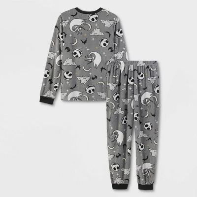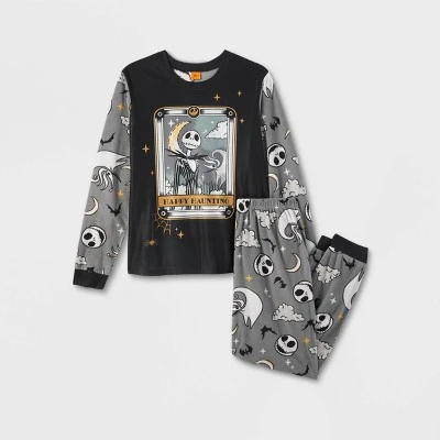 Get ready to welcome Halloween with a fan-favorite look in this 2-Piece Adult The Nightmare Before Christmas Jack Skellington Pajama Set. This set includes a long-sleeve pullover shirt and pajama pants, both crafted from a soft fabric for all-night comfortable wear. Designed in a black hue with gray sleeves, the pajama shirt features a tarot card-like print on the front with Jack Skellington and the message “Happy Haunting.” The accompanied pajama pants feature allover Jack Skellington and Zero illustrations, making the pair a great pick for movie nights or Halloween photo ops.