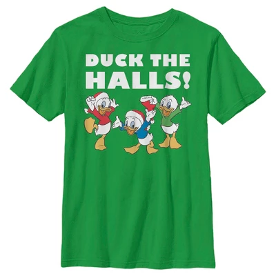 - Strut your stuff with this stylish new boys’ t-shirt that is perfect for the holiday season! Featuring Dewey Duck, Louie Duck, and Huey Duck wearing Santa hats with the text: “Duck the halls,” across the front.