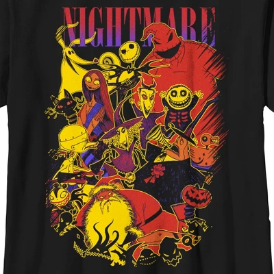 - Strut your stuff with this stylish new boys’ t-shirt that is perfect for every occasion! Featuring the word “Nightmare” below all the Halloween Town residents including Jack, Zero, Sandy, Oogie Boogie, Black Cat, Barrel, Lock, Shock, Doctor Finkelstein, Giant Snake, Mayor, Santa Claus, and Vampire Teddy.
