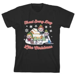 Make any day feel like Christmas when you wear this festive youth t-shirt! The Elf movie tee features a big colorful image of three chibi-style elves and the words “Treat Every Day Like Christmas” that has been professionally printed and applied to last long enough to get you through any adventure life throws your way! Made of 100% preshrunk cotton, the black t-shirt features short sleeves for style and comfort in any weather. The classic Christmas movie fan apparel can be machine washed with like colors, then tumble dried for easy care. As an officially licensed product, this “Treat Every Day Like Christmas” tee makes a perfect gift for any Elf fan.