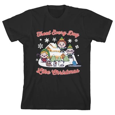 - CUSTOM DESIGNED Elf movie t-shirt features a big bold image of three chibi elves and the words “Treat Every Day Like Christmas” that has been professionally printed to ensure long-lasting print quality
