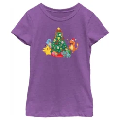 - Strut your stuff with this stylish new Christmas Girls’ T-Shirt that is perfect for the holidays! Featuring Pikachu, Squirtle, Charmander, and Bulbasaur celebrating around a Christmas tree decorated with candy canes, bows, festive lights, and Pokemon-shaped ornaments, including Jigglypuff, Delibird, and Eevee.