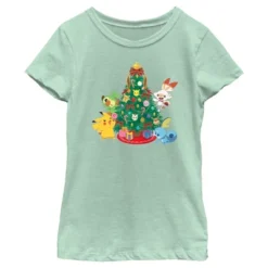 - Strut your stuff with this stylish new Christmas girls’ t-shirt that is perfect for the holidays! Featuring a graphic of Pikachu, Grookey, Scorbunny, and Sobble around an adorned Christmas tree with gifts.