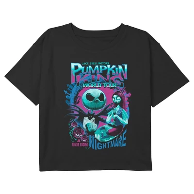 - Strut your stuff with this stylish new girls’ cropped t-shirt that is perfect for every occasion! Featuring a colorful poster design for Jack’s Pumpkin King World Tour with Sally, scary jack-o’-lanterns, and the phrase “A Never Ending Nightmare” adorning the front.