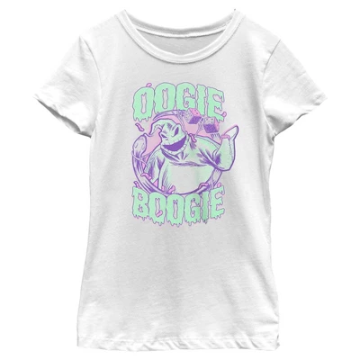 - Strut your stuff with this stylish new everyday Girls’ T-Shirt that is perfect for every occasion! Featuring Oogie Boogie surrounded by a scary snake, worms, and dice, and his name printed in green slime font.