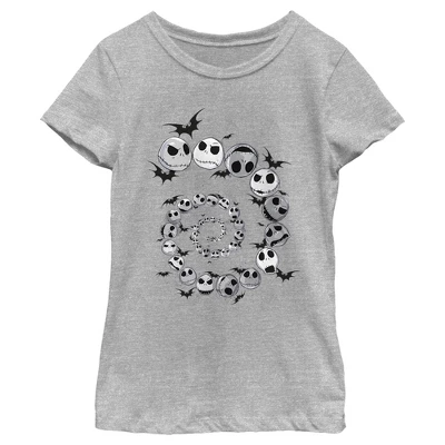 - Strut your stuff with this stylish new girls’ t-shirt that is perfect for every occasion! Featuring Jack Skellington’s face showing all his emotions in a cool spiral surrounded by bats printed across the front.