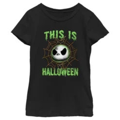 - Strut your stuff with this stylish new girls’ t-shirt that is perfect for the scariest time of the year! Featuring Jack’s face framed by orange spider webs and the iconic quote: “This Is Halloween” printed in slimy green font.