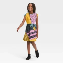 The Nightmare Before Christmas Sally Dress is perfect for wearing during the Halloween season. Your child will love flaunting their fandom for the classic movie with this printed pullover dress that is designed like Sally’s iconic patchwork dress in yellow, pink, teal blue and black. Made of a stretchy, lightweight scuba fabric, the knee-length dress features a scoop neckline and sleeveless design.