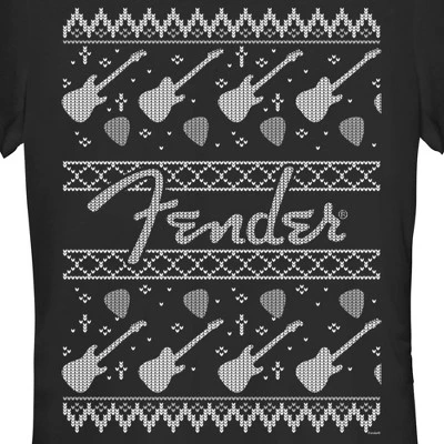 - Strut your stuff with this stylish new juniors’ t-shirt that is perfect for the holidays! Featuring the classic Fender logo surrounded by a fun ugly Christmas sweater print with guitars and picks across the front.