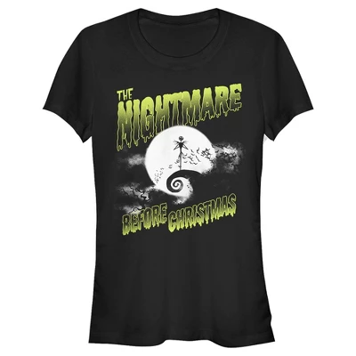 - Strut your stuff with this stylish new Halloween juniors’ tee featuring Jack Skellington at the top a hill with the full moon in the background and “The Nightmare Before Christmas” in a spooky dripping green font.