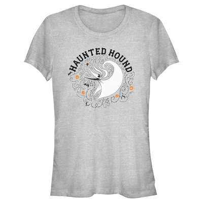 - Strut your stuff with this stylish new juniors’ t-shirt that is perfect for the scariest time of the year! Featuring the adorable Zero with bats, jack-o’-lanterns, thorns, and the phrase: “Haunted Hound” printed all around him.