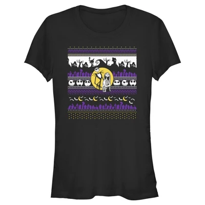 - Strut your stuff with this stylish new juniors’ t-shirt that is perfect for the scariest time of the year! Featuring Jack, Sally, bats, moons, and graveyards in an ugly sweater pattern across the front.