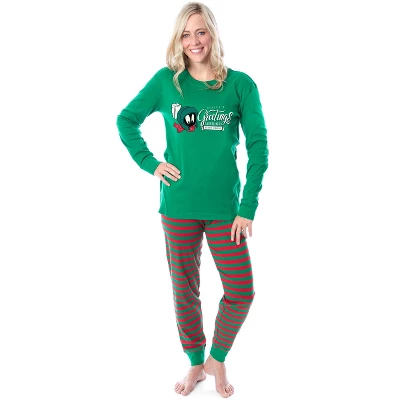 - CLASSIC DESIGN – This pajama features the character known as Marvin the Martian all bundled up for the Christmas season, as well as the phrase “Season’s Greetings Earthlings! Eat, Drink, Be Martian!”