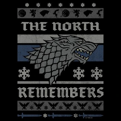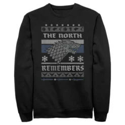 Christmas is coming! Don’t find yourself out in the winter cold without one of these officially licensed Men’s Black Game of Thrones Christmas The North Remembers Sweater Crewneck Sweatshirt! Featuring the iconic House Stark sigil in a festive Christmas sweater style and the words “The North Remembers.” The night may be dark and full of terrors, but that doesn’t mean your fashion choices need to be!