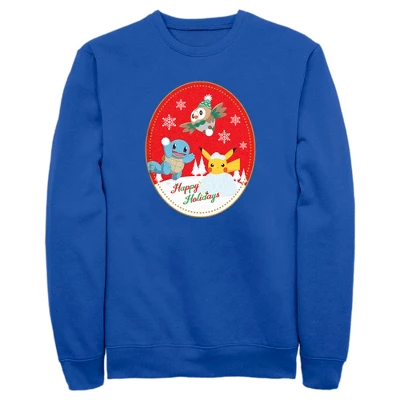- Strut your stuff with this stylish new Christmas Men’s Crewneck Sweatshirt that is perfect for the holidays! Featuring Pikachu, Squirtle, and Rowlet playing with snow and snowballs with the text “Happy Holidays” printed below and falling snowflakes in the background.