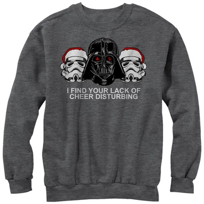 That’s not Santa you hear in the sky, it’s a TIE fighter carrying the Star Wars Christmas Empire Lack of Cheer Heather Charcoal Sweatshirt! Darth Vader’s helmet sits next to two stormtrooper helmets with Santa hats and the phrase “I Find Your Lack of Cheer Disturbing” printed on the front of this funny gray Star Wars Christmas sweatshirt.