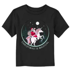 - The smallest family members are also the most stylish with this new toddlers’ t-shirt that is perfect for the holidays! Featuring the words: “Christmas Is Magical” with Santa riding a unicorn under a full moon across the front.