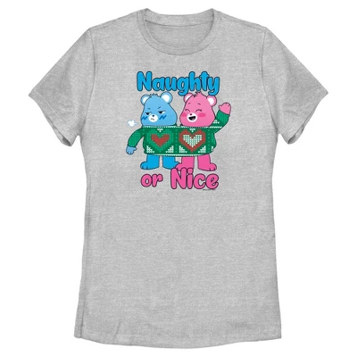 - Strut your stuff with this stylish new Christmas women’s tee that is perfect for the holidays! Featuring Cheer Bear and Grumpy Bear as cute cartoons sharing a heart-inspired Christmas sweatshirt, while framed by the text “Naughty or Nice” in colorful print.