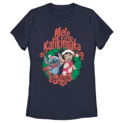 - Strut your stuff with this stylish new Christmas Women’s T-Shirt that is perfect for the holidays! Featuring Lilo and Stitch waving from the inside of a Christmas wreath while wearing Santa hats with “Mele Kalikimaka” printed above them