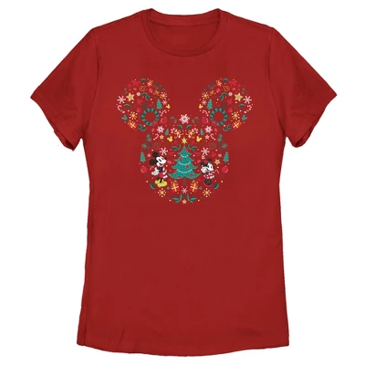 - Strut your stuff with this stylish new Christmas Women’s T-Shirt that is perfect for the holidays! Featuring a Mickey Logo filled with your favorite characters, including Mickey and Minnie Mouse, and Christmas ornaments, gifts, candies, hollies, snowflakes, and more!