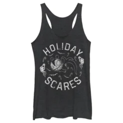 - Strut your stuff with this stylish new Halloween women’s tank featuring a black and white graphic of Scary Teddy and the phrase: “Holiday Scares.”