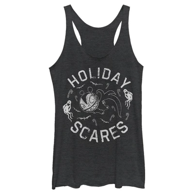 Make your way to Halloween Town and join the scary fun in this officially licensed Disney The Nightmare Before Christmas Halloween Holiday Scares Women’s Racerback Tank Top! This ghostly women’s design features a distressed, black and white graphic of Scary Teddy surrounded by ghosts, candy canes, and bats, along with the phrase: “Holiday Scares” across the front. You will not want to miss out on this tee that is perfect for the spooky Halloween season!